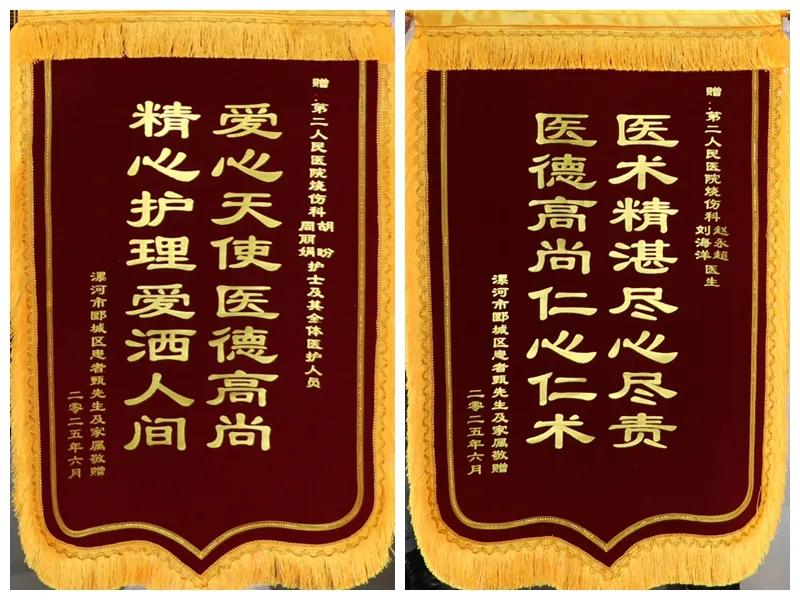 住院的日子里,每一天都讓患者感受到溫暖,每一名醫生,每一名護士,都讓他難忘。在出院時,患者及家屬激動不已:“沒想到我會恢復這么快,感謝你們的精湛醫術,是你們給了我第二次生命!”為表示感謝,患者特地囑托身在外地的兒子定制了兩面錦旗,送至科室醫護手中。