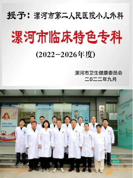 漯河市第二人民醫院小兒外科為河南省小兒外科專業聯盟單位、鄭大一附院河南省小兒外科疑難重癥診治聯盟單位,設床位50張,現有主任醫師1人,副主任醫師2人,主治醫師3人,醫師2人,科室擁有德國高清小兒腹腔鏡、胸腔鏡等設備,率先在我市開展小兒腹腔鏡、胸腔鏡等微創手術,主要診治各先天性腸閉鎖、先天性胃破裂、肛門閉鎖、急性闌尾炎、梅克爾憩室、小兒疝氣、小兒包皮過長及包莖、腸息肉、腸套疊、兒童膿胸、氣胸等疾病,尤其擅長小兒胸腹腔鏡治療。