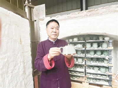 “天青色,瑪瑙釉。看著薄,摸著厚。芝麻釘,釉裹足。體輕巧,內含秀。香灰胎,蟬翼紋。晨星稀,潤如玉。很養眼,不刺目……”11月4日上午,在郾城區新店鎮雙樓徐村,記者見到了國家級非物質文化遺產項目汝瓷燒制技藝代表性傳承人王君子的徒弟徐大磊。一見到記者,徐大磊就用這段朗朗上口的順口溜,表達了他對天青釉汝瓷的喜愛之情。