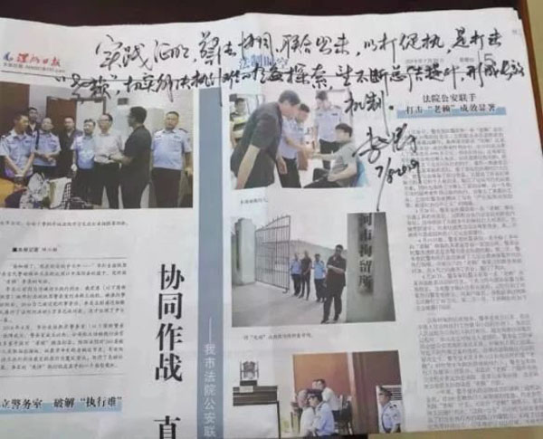 2019年8月13日,市委常委、市委秘書長李建濤專門就此作出批示,對警法協同、聯合出擊、“以打促執”的做法表示肯定,并希望警法雙方能將合作模式不斷進行總結和提升,形成長效機制,切實解決執行難。