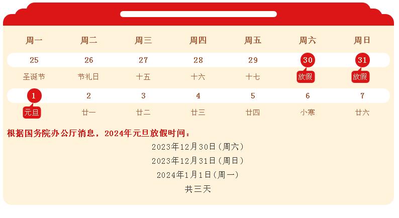 根據國務院辦公廳消息,2024年元旦放假時間: