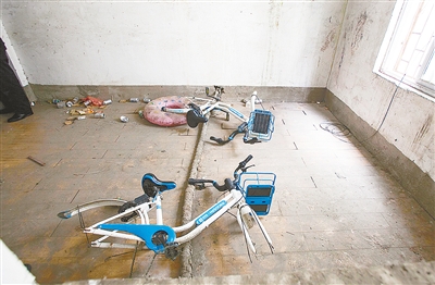 12月21日中午,記者來到市區漢江路與太行山路交叉口東北角的一處城中村,見三輛共享單車所在的民房垃圾遍地,一床破舊的鋪蓋堆放在一個房間里。被拆解的兩輛共享單車,在二樓的一個房間內,車輪不見了,車鎖也被破壞。