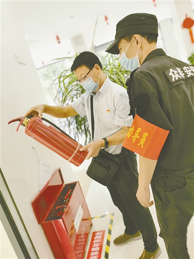 吳國安(左)正在銀行營業大廳檢查滅火器。