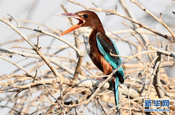 7月7日,在科威特首都科威特城海濱,一只白胸翡翠在鳴叫。 新華社發(哈齊 攝)