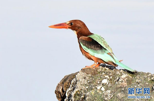 7月7日,在科威特首都科威特城海濱,一只白胸翡翠站在海邊巖石上。 新華社發(哈齊 攝)