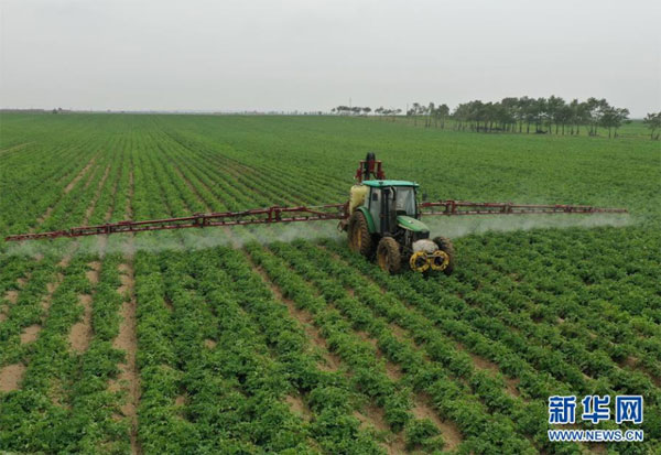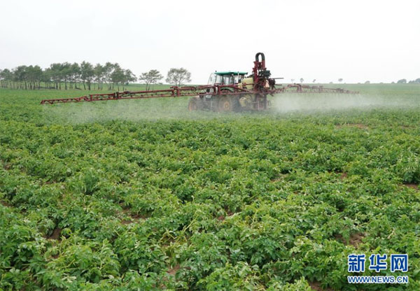 8月12日,在尚義縣三工地鎮有德元村,農民使用機械設備在田間給旱作馬鈴薯噴灑農藥。 近年來,地處壩上地區的河北省尚義縣大力實施地下水超采綜合治理,積極探索旱作雨養種植技術,發展馬鈴薯、莜麥和油葵等旱地農作物,促進生態環境恢復。據介紹,該縣2019年以來,先后關停灌溉用井1200余眼,旱地改草23萬畝,水澆地改旱地11萬畝。 新華社記者 楊世堯 攝
