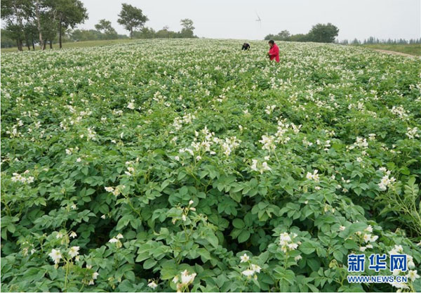 8月12日,在尚義縣七甲鄉媽奶溝村,農民在田間管護旱作馬鈴薯。 近年來,地處壩上地區的河北省尚義縣大力實施地下水超采綜合治理,積極探索旱作雨養種植技術,發展馬鈴薯、莜麥和油葵等旱地農作物,促進生態環境恢復。據介紹,該縣2019年以來,先后關停灌溉用井1200余眼,旱地改草23萬畝,水澆地改旱地11萬畝。 新華社記者 楊世堯 攝