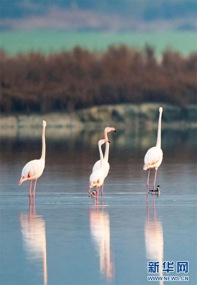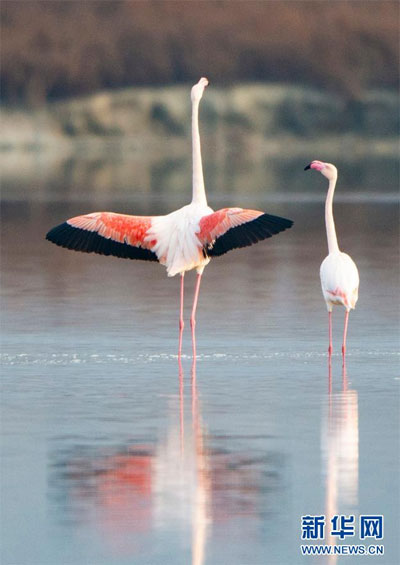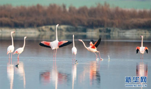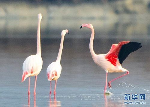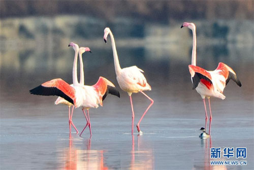 隨著氣溫下降,一些火烈鳥飛抵山西運城鹽湖,成為冬日鹽湖一道美麗的風景。