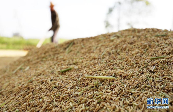 立秋過后,湖南省資興市種植的中稻陸續成熟,農民搶抓農時收割、晾曬稻谷,呈現一派忙碌景象。