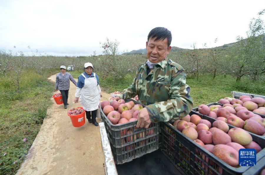 10月21日,在貴州省威寧彝族回族苗族自治縣牛棚鎮龍山種植專業合作社的蘋果園,曹杰的父親曹宣明(右一)和村民將剛采摘的糖心蘋果裝車。新華社記者 楊楹 攝