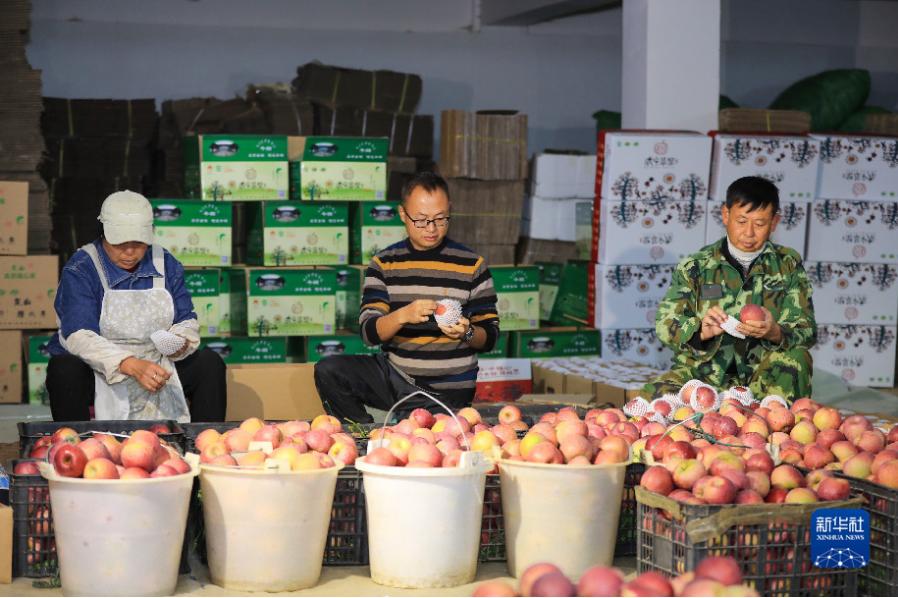 10月21日,在貴州省威寧彝族回族苗族自治縣牛棚鎮龍山種植專業合作社的蘋果園,曹杰(右二)和父親曹宣明(左二)將剛采摘的糖心蘋果裝筐。新華社發(韓賢普 攝)