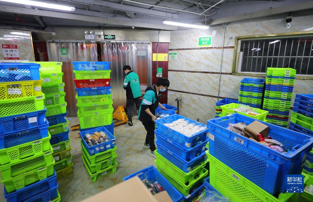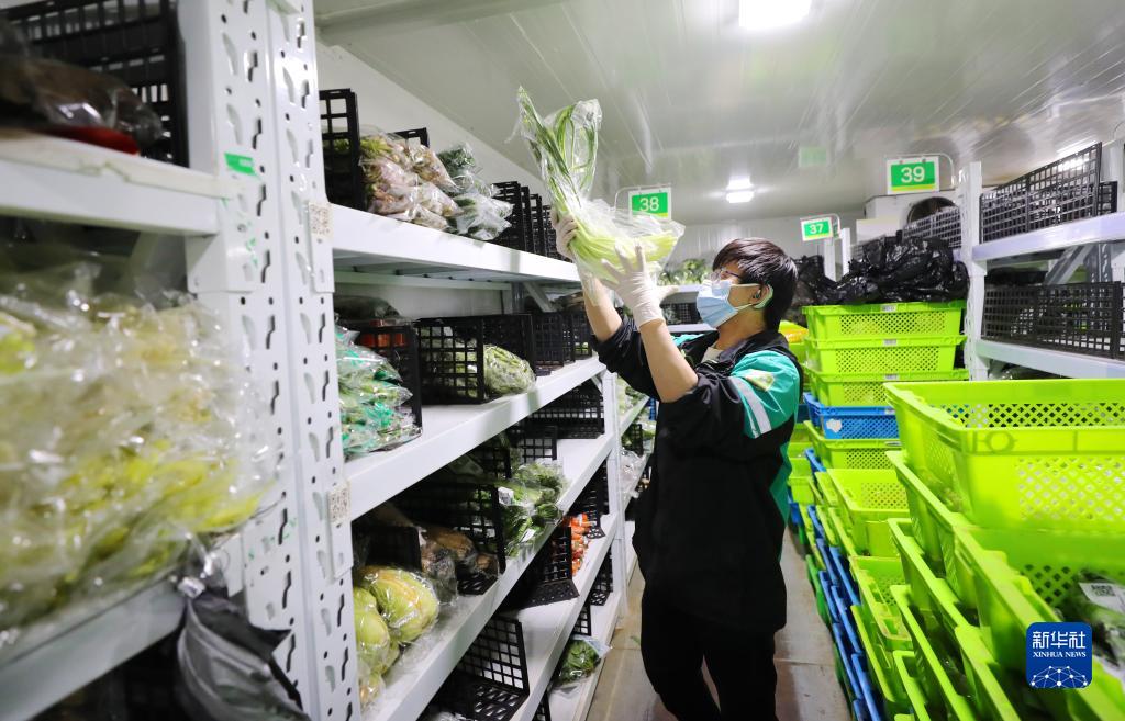 3月15日深夜,在位于上海閔行區老滬閔路的一家網絡購物平臺倉配站點,工作人員在冷藏庫內將新到貨的蔬菜分類擺放到貨架上。