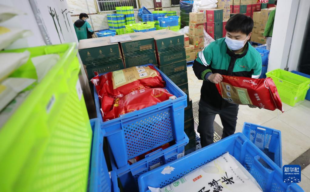 3月16日凌晨,在位于上海閔行區老滬閔路的一家網絡購物平臺倉配站點,工作人員在搬運新到的大米。