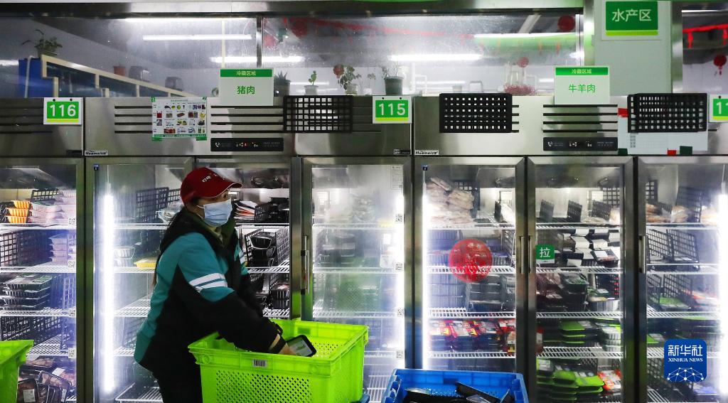 3月15日深夜,在位于上海閔行區老滬閔路的一家網絡購物平臺倉配站點,工作人員將一批生鮮肉制品放入冷藏柜。