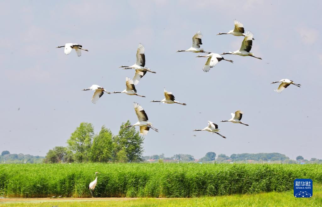 丹頂鶴在黑龍江扎龍國家級自然保護區自由翱翔(2022年6月15日攝)。 新華社發(宋燕軍 攝)