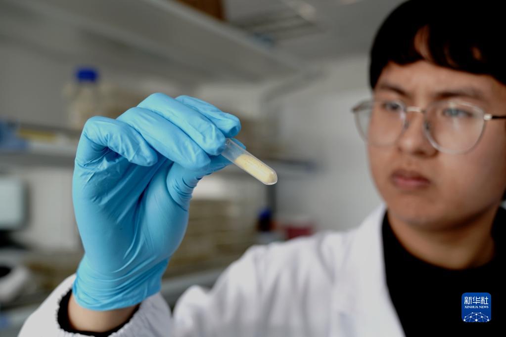 11月16日,中國科學院分子植物科學卓越創新中心博士生朱一棟觀察需測定蛋白的玉米粉末樣品。