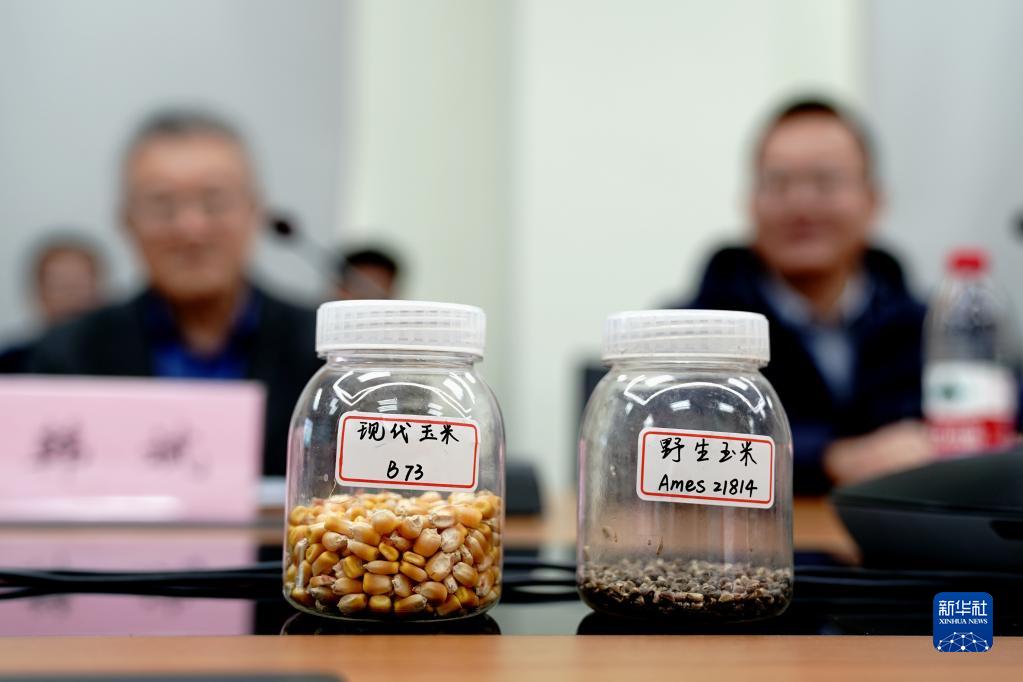 11月16日在中國科學院分子植物科學卓越創新中心拍攝的野生玉米種子和現代玉米種子。