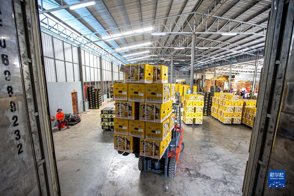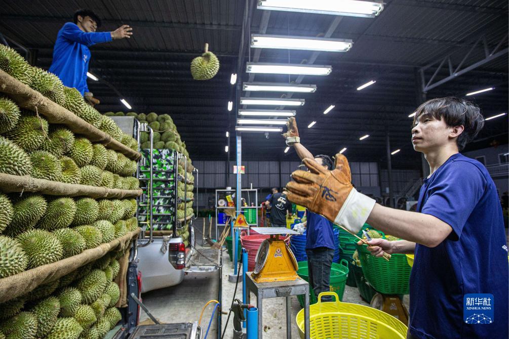 9月19日,在泰國(guó)春蓬府一家榴蓮工廠內(nèi),工作人員將包裝好的榴蓮裝車。
