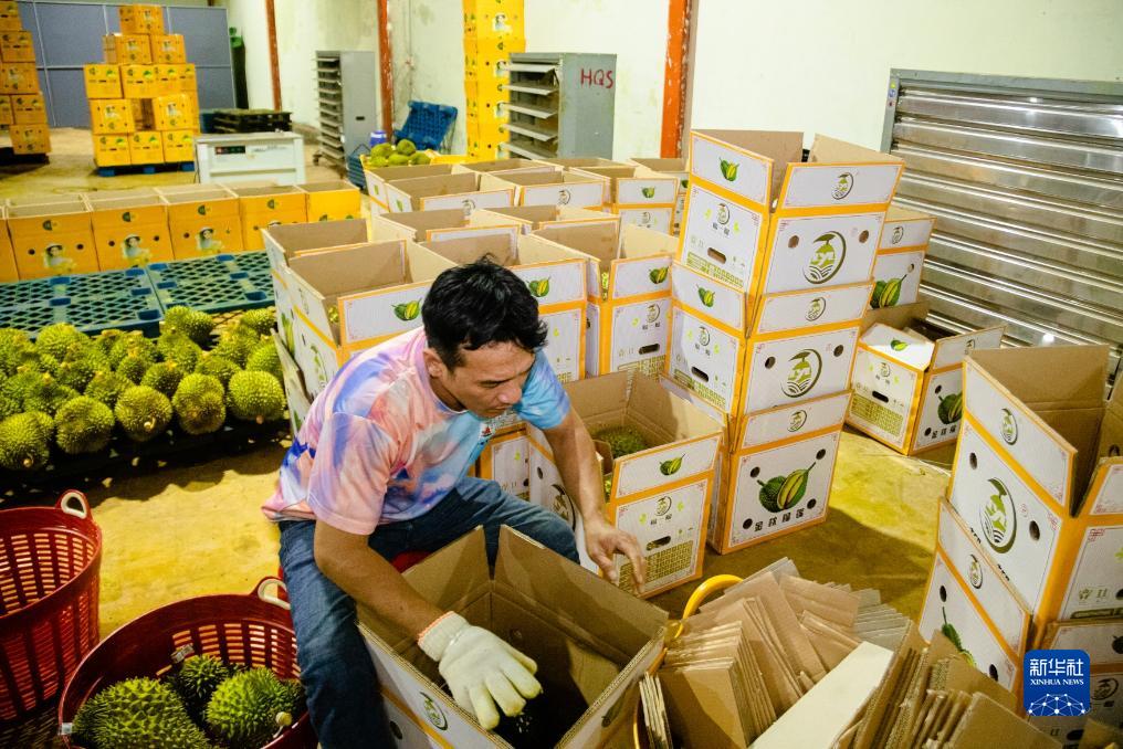 9月15日,在越南多樂(lè)省一家榴蓮加工廠,一名工人在打包榴蓮。